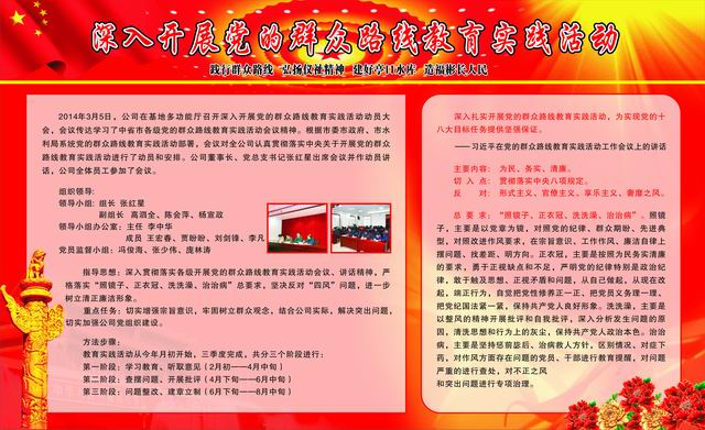 2014年3月5日,公司深入開(kāi)展黨的群眾路線(xiàn)教育實(shí)踐活動(dòng)動(dòng)員大會(huì )在基地多功能廳召開(kāi)。會(huì )議傳達學(xué)習了中省市各級黨的群眾路線(xiàn)教育實(shí)踐活動(dòng)工作會(huì )議精神,根據市委市政府、市水利局系統黨的群眾路線(xiàn)教育實(shí)踐活動(dòng)部署,對全公司認真開(kāi)展落實(shí)黨的群眾路線(xiàn)教育實(shí)踐三個(gè)階段(2月——8月)的活動(dòng)進(jìn)行了動(dòng)員和部署,成立了活動(dòng)領(lǐng)導小組,領(lǐng)導小組辦公室,黨員監督小組。公司董事長(cháng)、黨總支書(shū)記張紅星出席會(huì )議并作動(dòng)員講話(huà),公司全體員工參加了會(huì )議。